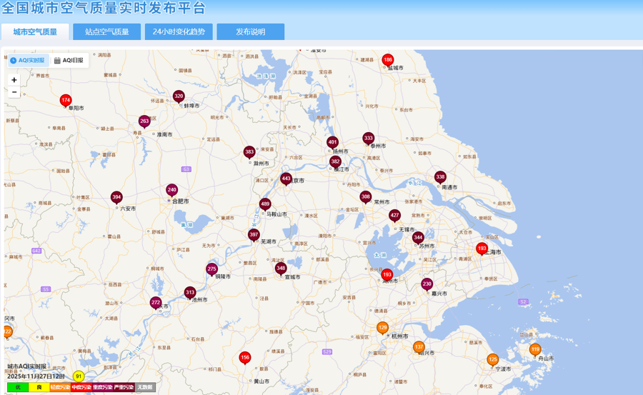 11月27日12时,全国部分地区城市实时空气质量指数,污染气团自西向东输送,已影响长三角地区。南通、无锡、苏州、嘉兴等地空气质量已是重度及以上程度的污染。 来源:全国城市空气质量实时发布平台