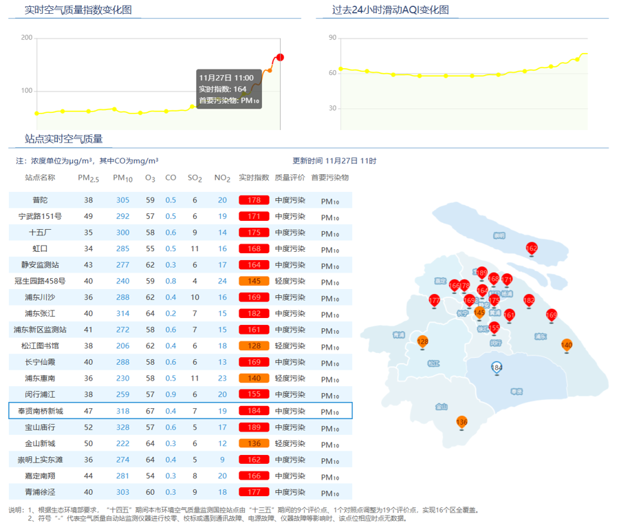 11月27日11时,上海实时空气质量情况。 来源:上海市生态环境局